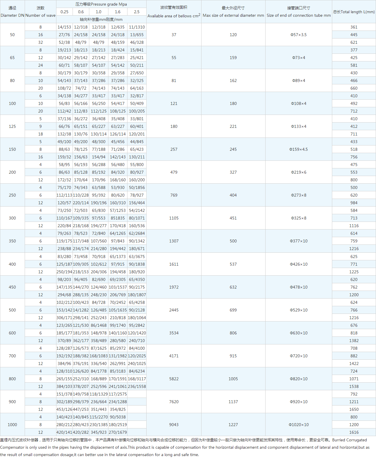 7、直埋內(nèi)壓波紋補(bǔ)償器要求在兩固定支座之間,只裝一個(gè)波紋補(bǔ)償器其補(bǔ)償器對(duì)支座作用力的計(jì)算與單式波紋補(bǔ)償器對(duì)支座作用力的計(jì)算相同。由于直埋內(nèi)壓波紋補(bǔ)償器在管道上實(shí)現(xiàn)自由補(bǔ)償和安裝簡單等特點(diǎn),因而深受工程設(shè)計(jì)及安裝使用者的歡迎。直埋外壓式波紋管補(bǔ)償器具備外壓式補(bǔ)償器及自由補(bǔ)償直埋式補(bǔ)償器的雙重有點(diǎn)在熱網(wǎng)管道施工中得以廣泛的應(yīng)用。