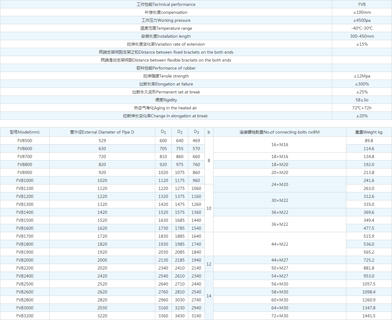 FVB型風(fēng)道橡膠補(bǔ)償器由橡膠復(fù)合材料、鋼制法蘭、套筒、保溫隔熱材料組成,主要用于各種風(fēng)機(jī)、風(fēng)管之間的柔性連接,其功能是減震、降噪、密封、耐介質(zhì)、便于位移和安裝。是環(huán)境保護(hù)領(lǐng)域中一種極為理想的減震、降噪、消煙除塵的佳配套件。