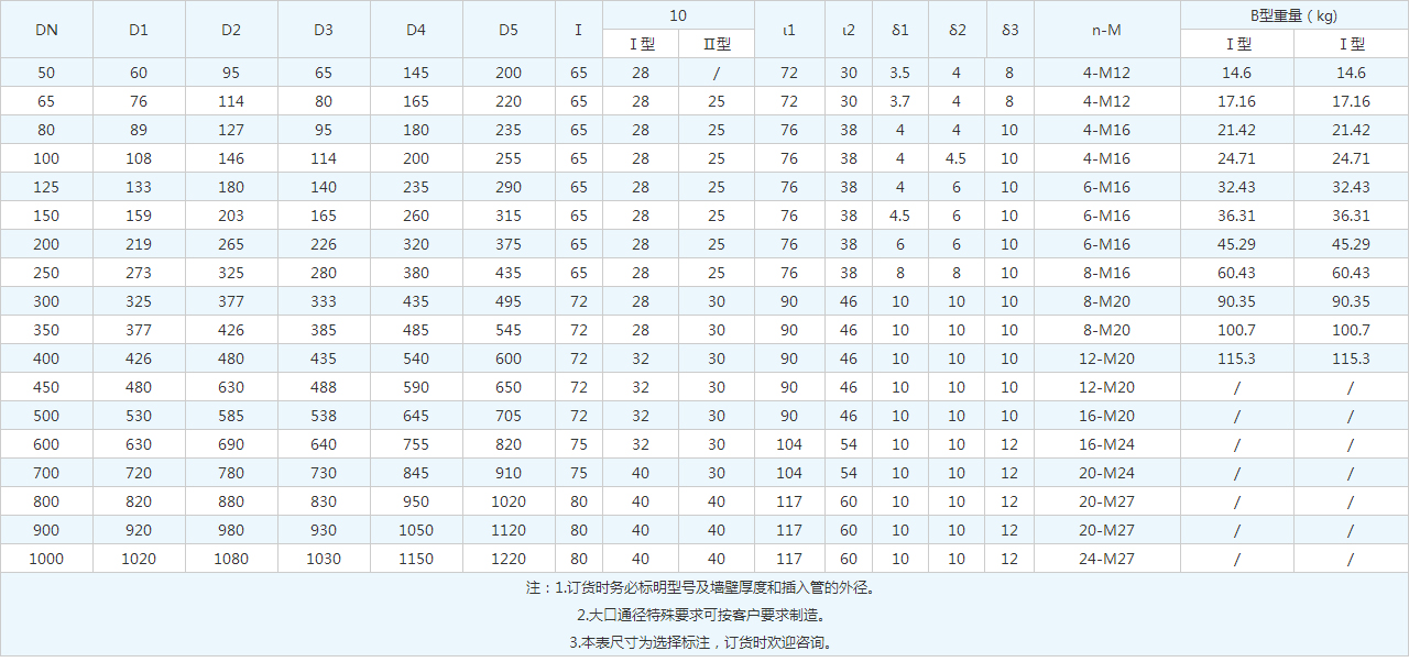 DN | D1 | D2 | D3 | D4 | D5 | Ⅰ | 10 | ι1 | ι2 | δ1 | δ2 | δ3 | n-M | B型重量(kg) | |||