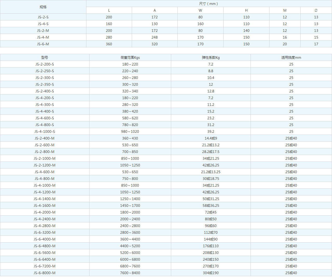 型號 | 荷重范圍Kgs | 彈性系數(shù)Kg | 適用撓度mm |