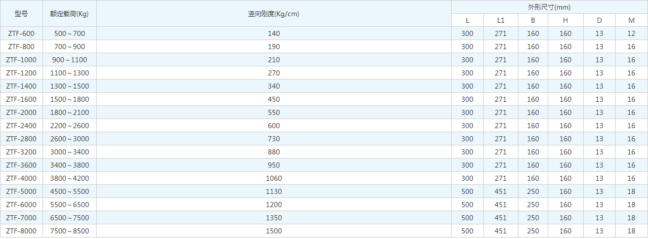 型號(hào) | 荷重范圍Kgs | 彈性系數(shù)Kg/mm |