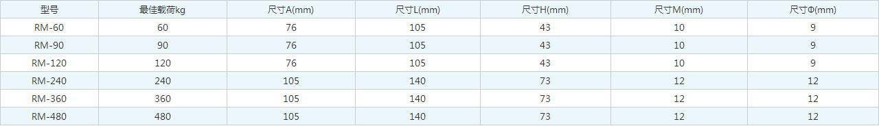 型號 | 很佳載荷kg | 尺寸A(mm) | 尺寸L(mm) | 尺寸H(mm) | 尺寸M(mm) | 尺寸Ф(mm) |