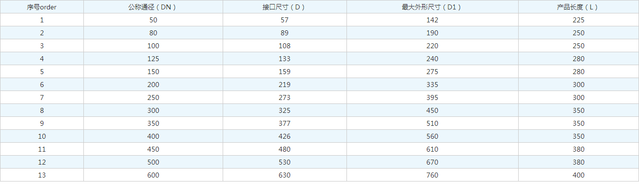 序號(hào)order | 公稱通徑(DN) | 接口尺寸(D) | 很大外形尺寸(D1) | 產(chǎn)品長度(L) |