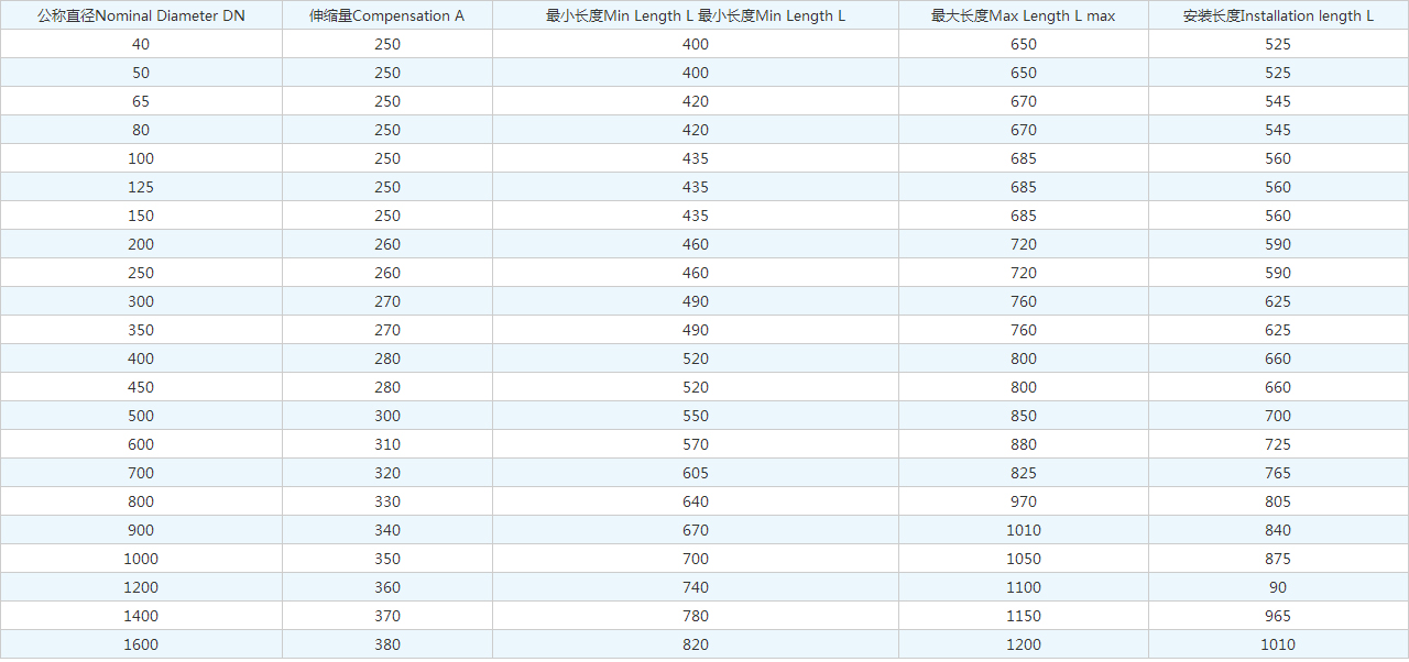 公稱直徑Nominal Diameter DN | 伸縮量Compensation A | 很小長度Min Length L 很小長度Min Length L | 很大長度Max Length L max | 安裝長度Installation length L |