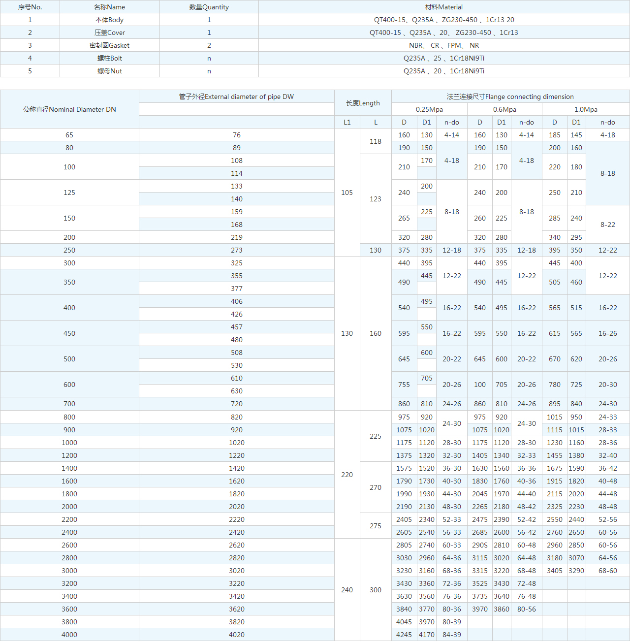公稱直徑Nominal Diameter DN | 管子外徑External diameter of pipe DW | 長度Length | 法蘭連接尺寸Flange connecting dimension | |||||||||